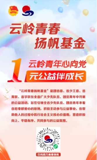 云南青基会也倡议全省少年儿童争做云南希望工程小小志愿者,积极传播参与“云岭青春扬帆基金”公益项目,参与人人公益,从小做起,手拉手童心共筑中国梦。(完)