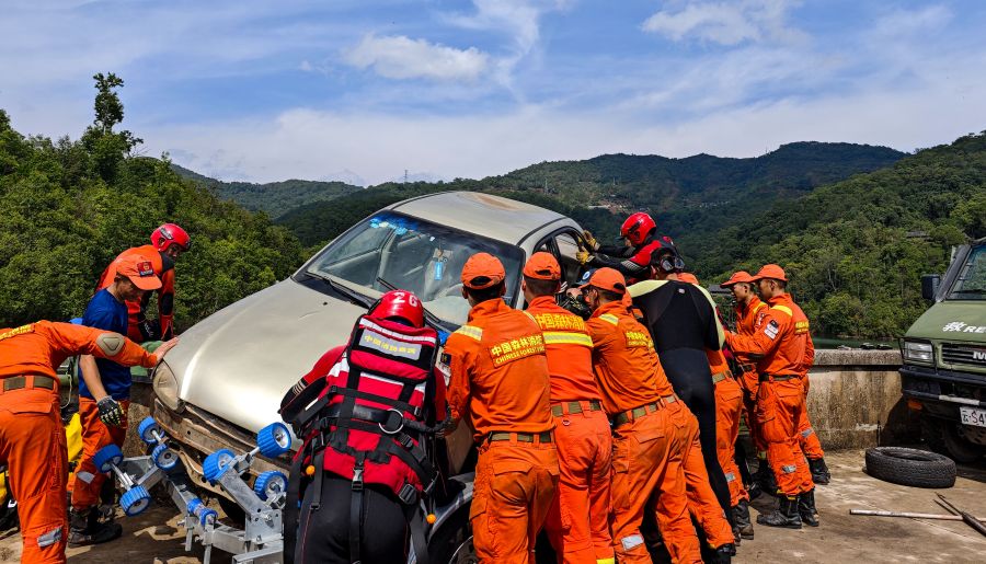 模拟车辆落入深水救援训练,消防员合力将车辆打捞上岸(5月29日摄)。