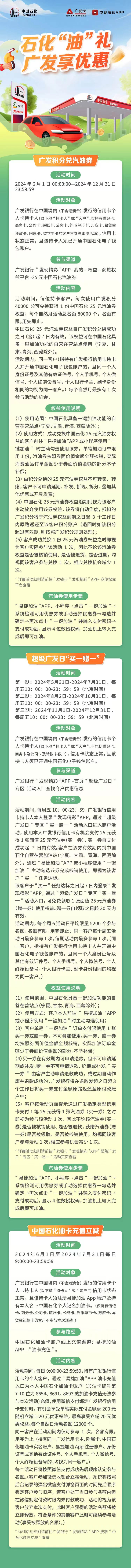 今年6月1日至12月31日,为持续巩固与广发银行股份有限公司(简称“广发银行”)优惠权益合作成果,促进客户满意度、忠诚度提升,中国石化销售股份有限公司云南石油分公司(简称“中石化云南石油分公司”)与广发银行联合开展2024年度专项营销活动。