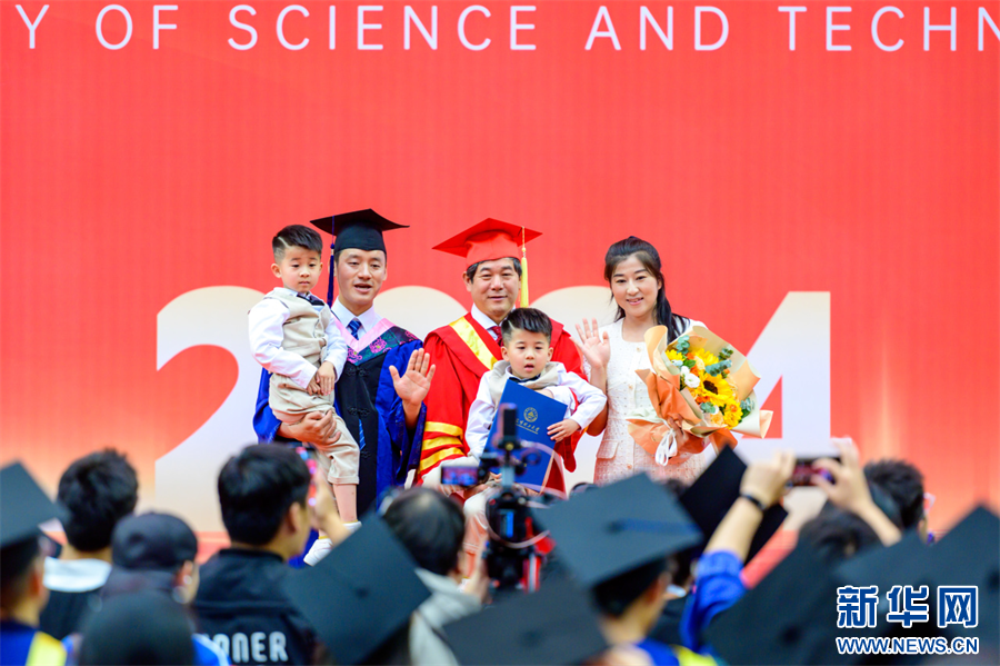20日,昆明理工大学2024年毕业典礼暨学位授予仪式在该校呈贡校区举行,见证11877名2024届毕业生启航新征程。活动现场,昆明理工大学吉祥物“酷斯特”亮相与毕业生们互动,一个个“名场面”又出现在毕业典礼现场,其中一名硕士毕业生携妻子和双胞胎儿子与校长王华合影,共同见证这一重要时刻。