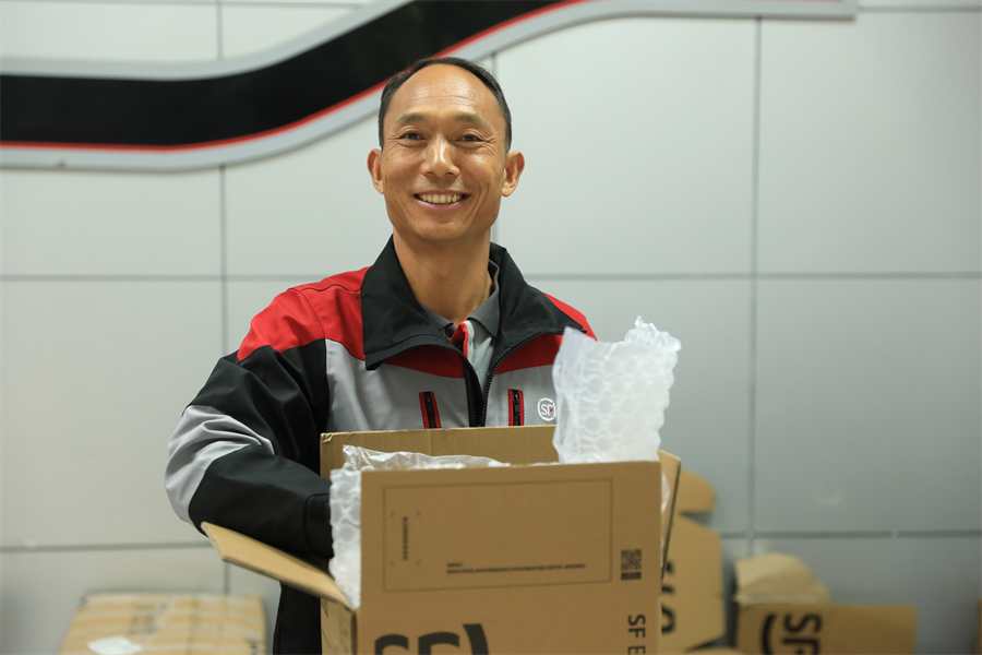 全国五一劳动奖章获得者、盘龙区云南顺丰速运有限公司党支部党员者发贵分装快递、派送快件 母灿全 摄