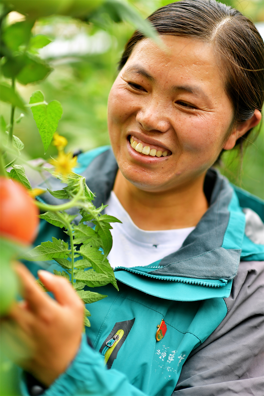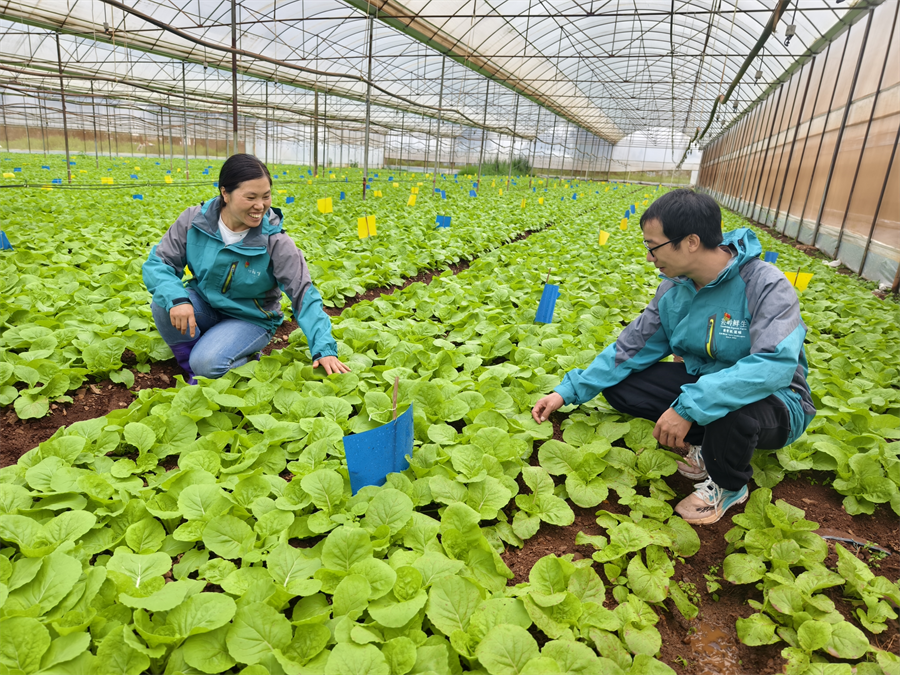 盘龙区滇源街道芸岭鲜生有机种植(松华坝)基地联合党支部书记胡亚丽、党员关丰智在“盒马村”培育种植有机蔬菜 夏廷安 朱维祥 摄
