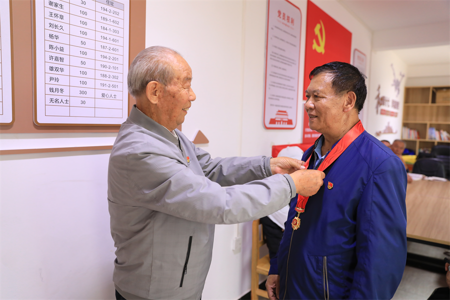 盘龙区联盟街道金星社区94岁老党员蒋士杰为71岁老党员杜学文佩戴“光荣在党50年”纪念章 母灿全 摄