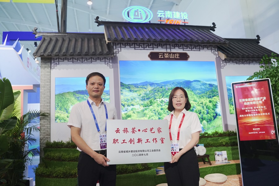 云南省城乡建设投资有限公司工会向弥勒美憬阁精选酒店授予“云旅荟·心艺家职工创新工作室”牌匾(7月24日摄)。
