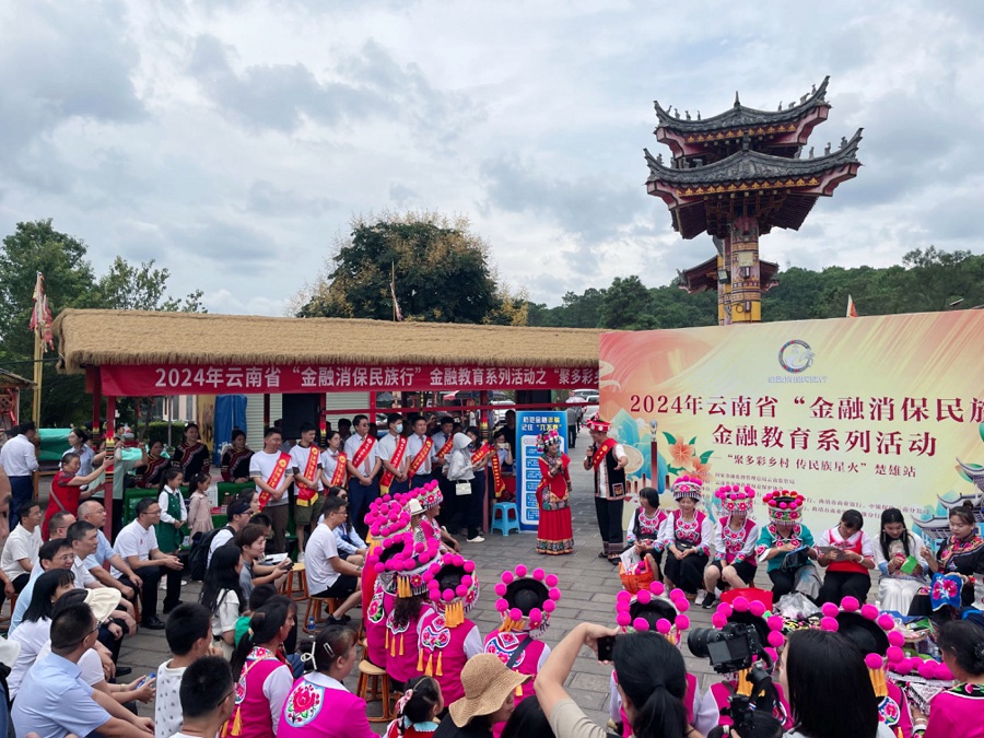 在楚雄市太阳历文化园火把广场开展的“聚多彩乡村 传民族星火”主题活动,同样保持了较高热度,现场工作人员身穿彝族特色服饰,通过发放宣传折页、讲解案例、服务咨询等方式,向市民游客宣传金融知识,提醒市民游客增强消费者权益保护意识。