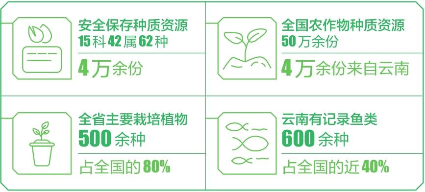 加强种质资源库建设。云南省高质量推进国家区域性畜禽遗传资源基因库、干热区特色作物种质资源圃、高原特色作物种质资源中期库等建设,已建成省级以上农作物种质资源圃、库36个(国家级4个);省级以上畜禽遗传资源保种场、区、库42个(国家级9个),水产种质资源保护区21个(国家级15个),规范保存作物种子、植株和畜禽遗传材料近20万份,水产资源保护区面积达3万公顷。