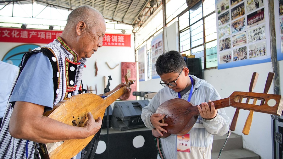 走进泸水市大练地街道新建村非物质文化遗产传习馆,国家级非物质文化遗产傈僳族民歌省级代表性传承人、大练地街道新建村民族民间艺术团团长何贵志正在给孩子们讲授傈僳族传统乐器“期奔”的发展历程和弹奏方法,孩子们边听边学,逐渐掌握了弹奏“秘诀”,古朴悠扬的音乐声在传习馆里回荡。