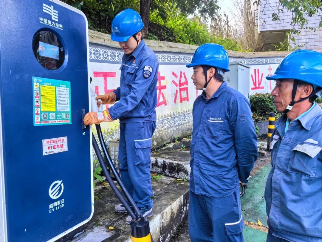10月1日,南方电网云南红河屏边供电局和平供电所工作人员对屏边县和平镇的公共充电桩开展检查,确保国庆期间群众绿色出行充电无忧。(高磊)