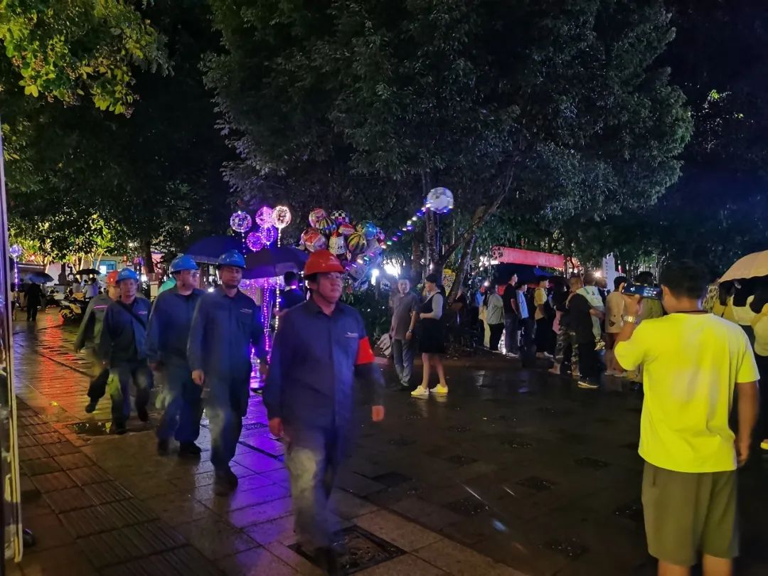 10月1日,普洱西盟江三木落剧院广场人头攒动,为确保节日期间庆祝活动顺利进行,南方电网云南普洱西盟供电局工作人员现场值守。(郤小海)