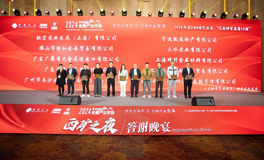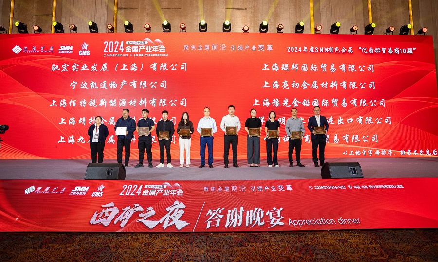 近日,2024SMM(第十三届)金属产业年会在青海省西宁市举行,驰宏实业发展(上海)有限公司(以下简称“驰宏实业”)荣获2024年度SMM有色金属“优质铅贸易商10强”和2024年度SMM有色金属“优质锌贸易商10强”2项荣誉。