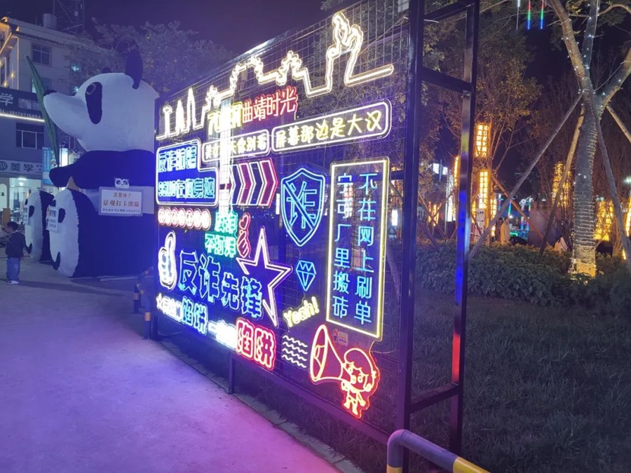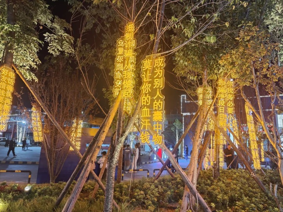 近日,走近云南省曲靖市麒麟区益宁街道花柯社区夜市旁的反诈主题广场,满眼是创意十足的霓虹标语、新颖别致的反诈宣传展板、具有视觉冲击力的反诈主题雕塑……浓浓的“反诈气息”扑面而来,新颖有趣的反诈宣传吸引着来往人群纷纷驻足打卡,学习反诈知识。