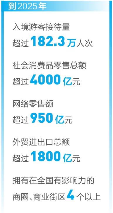 具体目标为:推动昆明城市知名度、消费繁荣度、商业活跃度、到达便利度显著提升,形成一批具有竞争力的“城市名片”,更好满足人民对美好生活的向往。到2025年,入境游客接待量超过182.3万人次,举办或承办国际国内重大展会、活动与赛事数量不低于50场,新增国际知名品牌首店10个;社会消费品零售总额超过4000亿元,网络零售额超过950亿元,外贸进出口总额超过1800亿元;拥有在全国有影响力的商圈、商业街区4个以上,中心城区“一刻钟便民生活圈”覆盖率80%以上,拥有国家级夜间文化和旅游消费集聚区5个以上,拥有退税商店(网点)4个以上;国际国内航班通达城市、航线数量分别超过175个、500条,南亚东南亚通航点数量超过17个,机场旅客吞吐量超过2200万人次,高铁、动车到达对数每天超过175对。