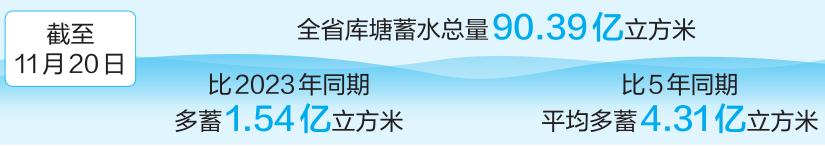 记者从省水利厅获悉,截至11月20日,全省库塘蓄水总量90.39亿立方米,比2023年同期多蓄1.54亿立方米,比5年同期平均多蓄4.31亿立方米,提前超额完成今年全省库塘蓄水目标任务。