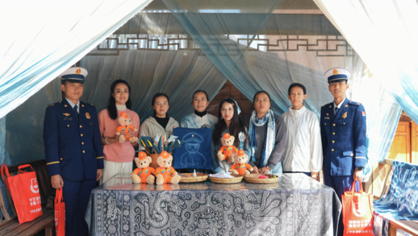 消防员与扎染手艺人合影(11月29日摄)。罗艺坤 摄