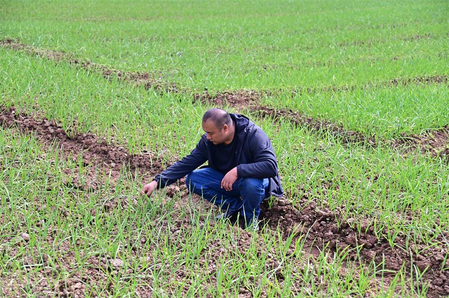 王金智在查看蒜苗长势(11月27日摄)。陈志萍 摄