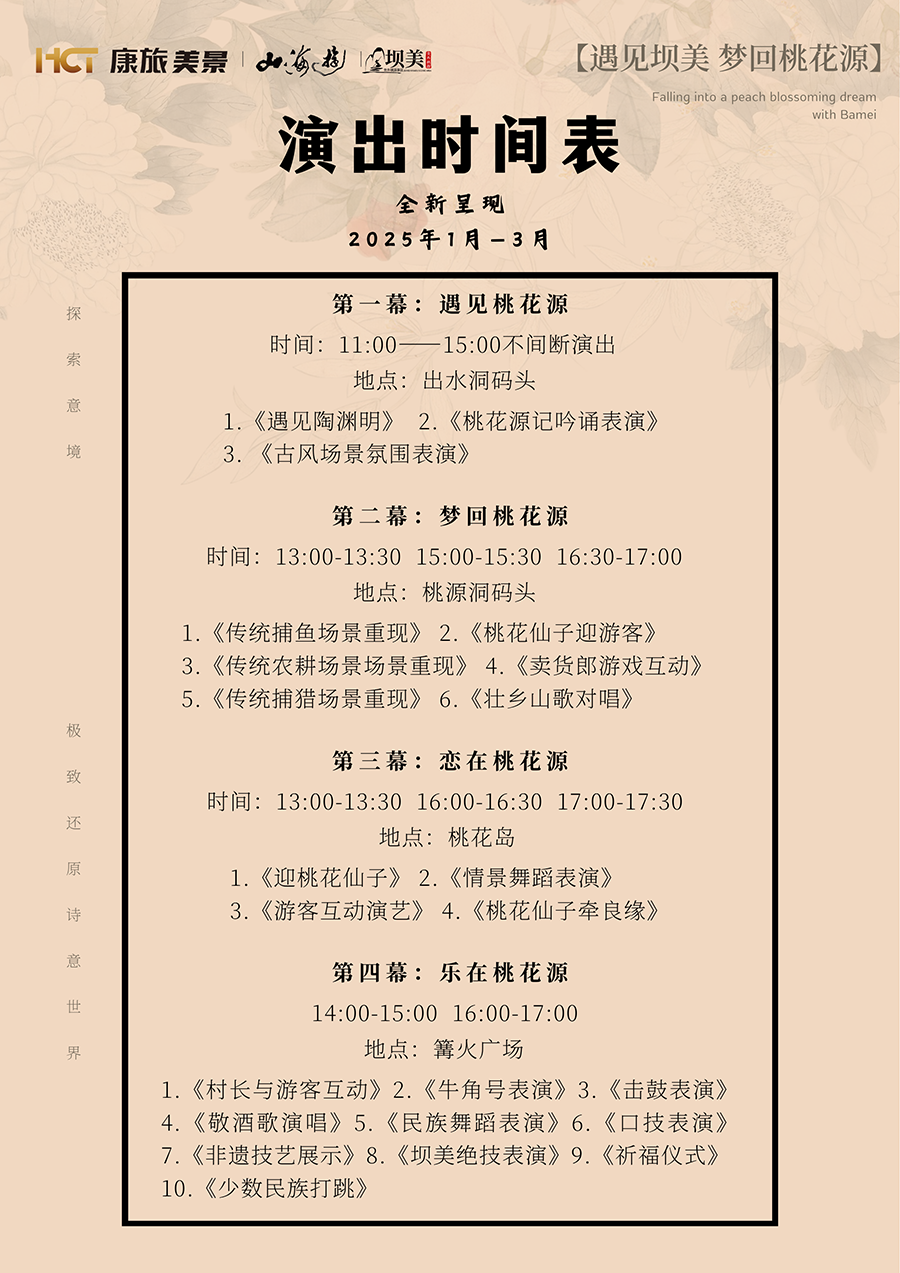 演艺巧妙利用坝美世外桃源4A级旅游景区得天独厚的自然景观,山水、田园、村落建成了天然的舞台背景,与演员们精彩的演艺融合。本次演艺打破了台上演台下看的传统演艺形式,采用互动式演艺呈现,游客从抵达码头开始就是故事的主角,乘船相遇特定角色,一同走进诗意画卷。