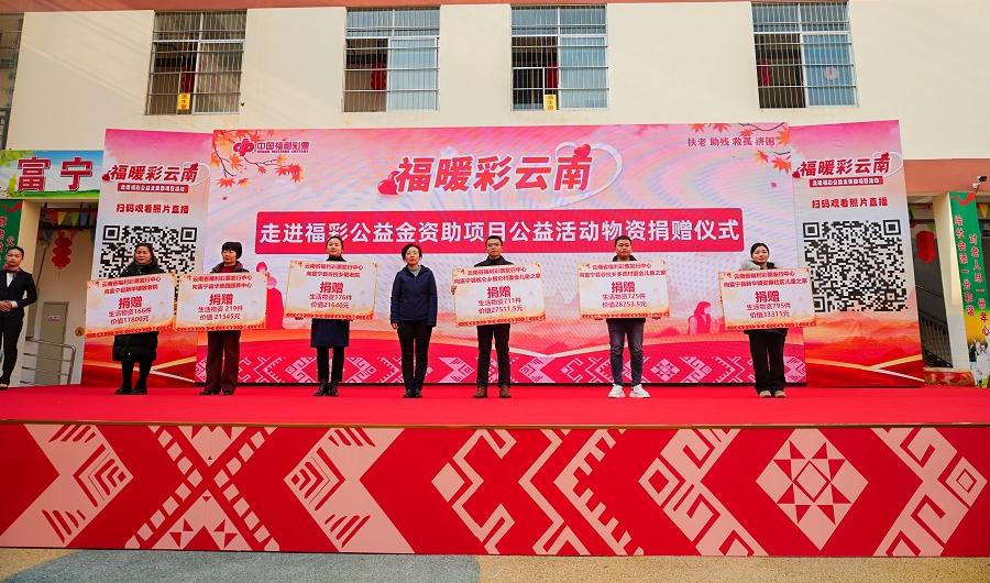 活动当天,云南省福利彩票发行中心向富宁县华翠园颐养中心、富宁县新华镇敬老院、富宁县谷拉乡敬老院、富宁县新华镇安康社区儿童之家、富宁县板仑乡板仑村委会儿童之家、富宁县谷拉乡多贡村委会儿童之家等6家民政福利机构捐赠了价值15万元的生活物资和康养设备,为困难老人和儿童带去了寒冬的温暖。