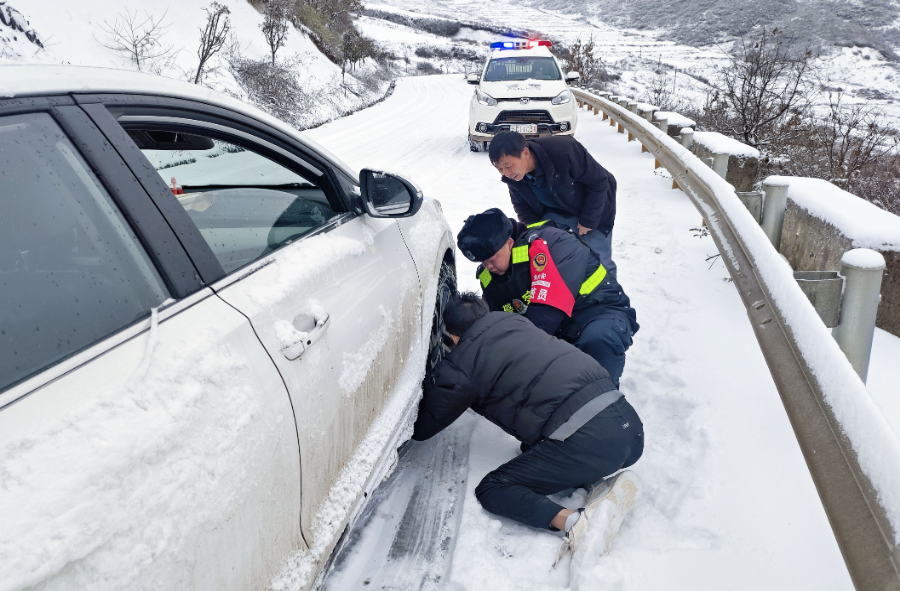 开展安全提醒,督促指导车辆戴上防滑链。风雪中,参与抗冰保通的民警辅警浴雪而立、迎寒而战,提醒过往车辆驾驶员一定要保持车距、减速慢行,并督促驾驶员为车子戴上防滑链,遇到不会戴防滑链的驾驶员,现场给予指导和帮助。
