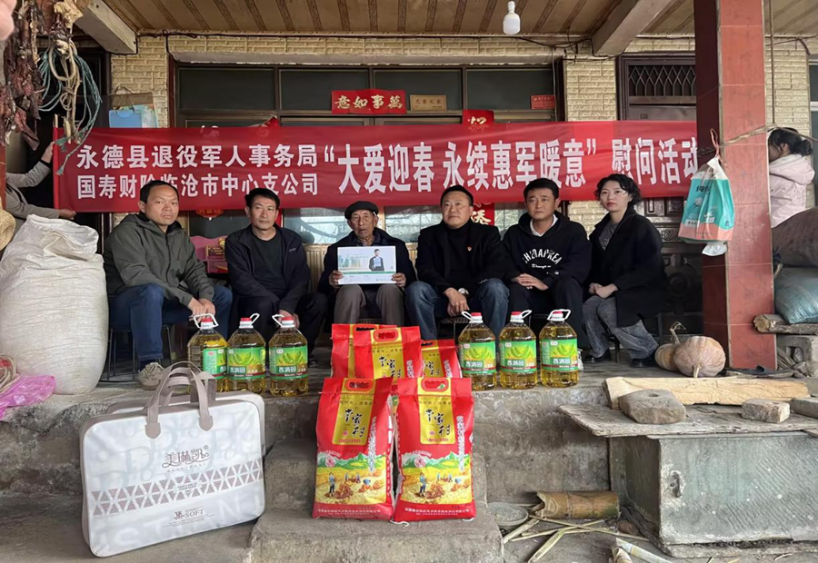 春节前,中国人寿财产保险股份有限公司临沧市中心支公司联合永德县退役军人事务局等相关部门,到临沧市永德县小勐统镇梅子箐村新寨组81岁退伍老兵李玉林家进行慰问。公司表达了对退役军人李玉林老人的敬意,赠送了“惠军三期防癌抗癌保险”和生活物资,并致以新春的祝福。