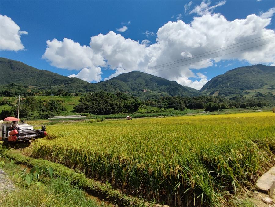 烟后水稻收割(资料图)。周福宴 摄