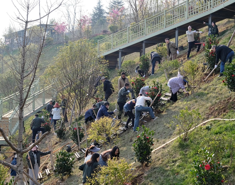 2024年植树活动中,云南省烟草烟叶公司44名党员群众自发捐款,种下12株紫薇树,打造“先锋林”。2025年,植树活动参与人数增加至97人,募集资金规模也随之扩大,新栽种50株山茶花苗,“先锋林”从绿化道延伸至栈道边坡,进一步推动了“党建带工建、工建促生态”良性循环发展。