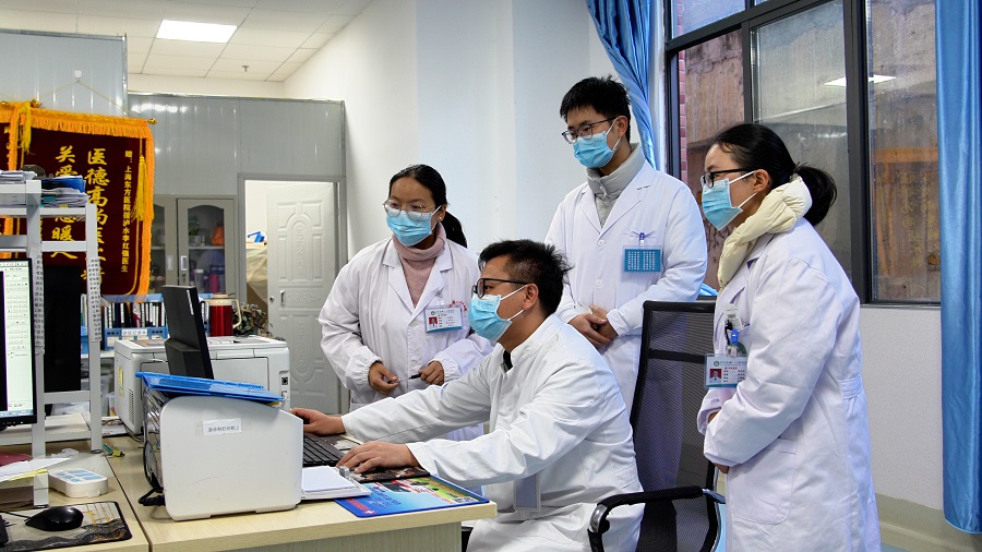上海市东方医院医生李红强带领泸水市第一人民医院医务人员开展呼吸病人病例讨论(资料图)。