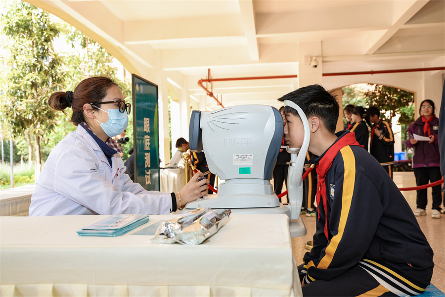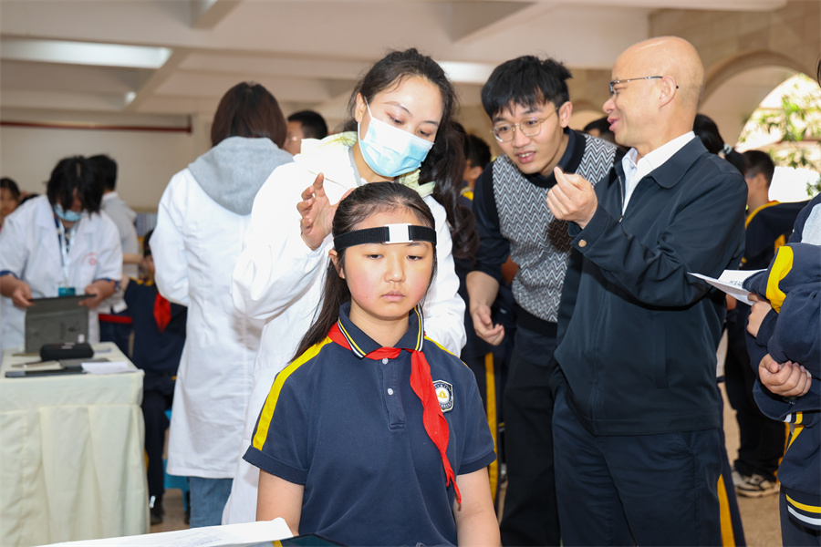 活动现场,云南大学附属医院和云南省体育运动创伤专科医院的工作人员在国家体育总局运动医学研究所专家的指导下,采用视力检测专业设备对参与检测的学生进行裸眼视力测试、屈光度测试、眼轴长度和角膜曲率测试以及眼底测试,全面筛查学生们的视力情况。