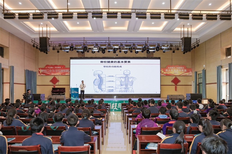 在脊柱健康检测区域,工作人员针对参加检测的学生进行Adam前屈试验、躯干旋转角测量、脊柱曲度测试及颈椎活动度测试,全面评估学生们的脊柱健康状况。此外,国家体育总局运动医学研究所助理研究员姚天奇在科普讲座上针对学校教师和学生进行了《青少年脊柱与视力健康操(站姿)》培训,引导学生们养成良好的用眼习惯,并学习脊柱健康发育的相关知识。