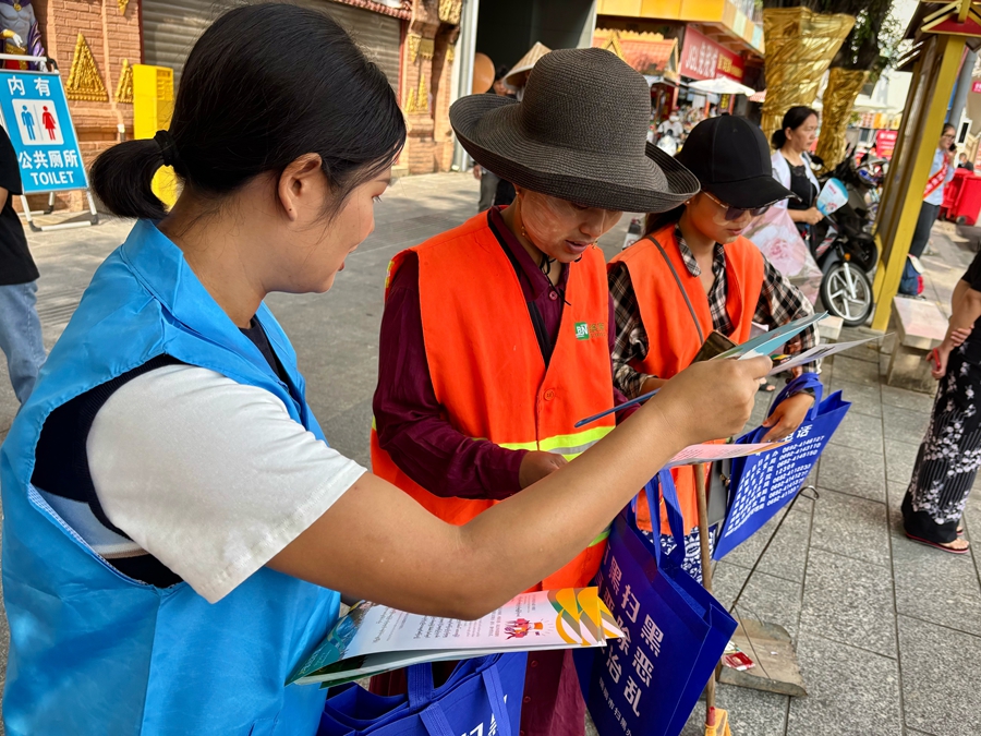 普法志愿者向群众发放宣传资料(5月15日摄)。盈江县司法局 供图