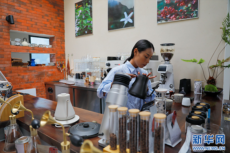 周开艳在制作咖啡(6月14日摄)。新华网发