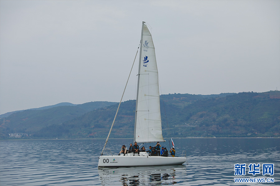 游客在抚仙湖体验帆船(6月10日摄)。新华网发