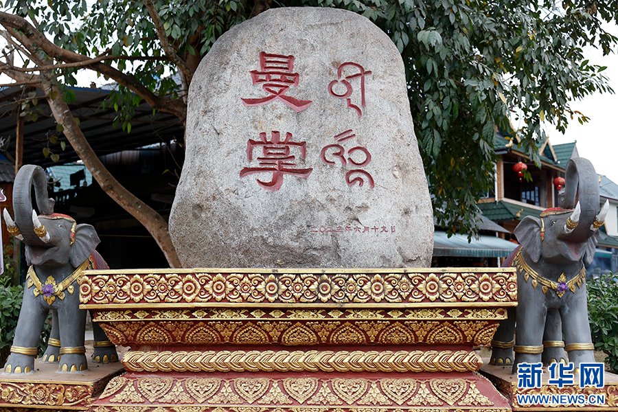 刻有“曼掌”二字的石头及小象雕塑(3月8日摄)。新华网发(徐华陵 摄)