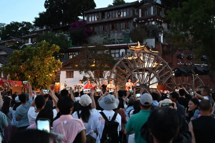 丽江民谣乐队在玉河广场演出(资料图)。丽江古城保护管理局 供图