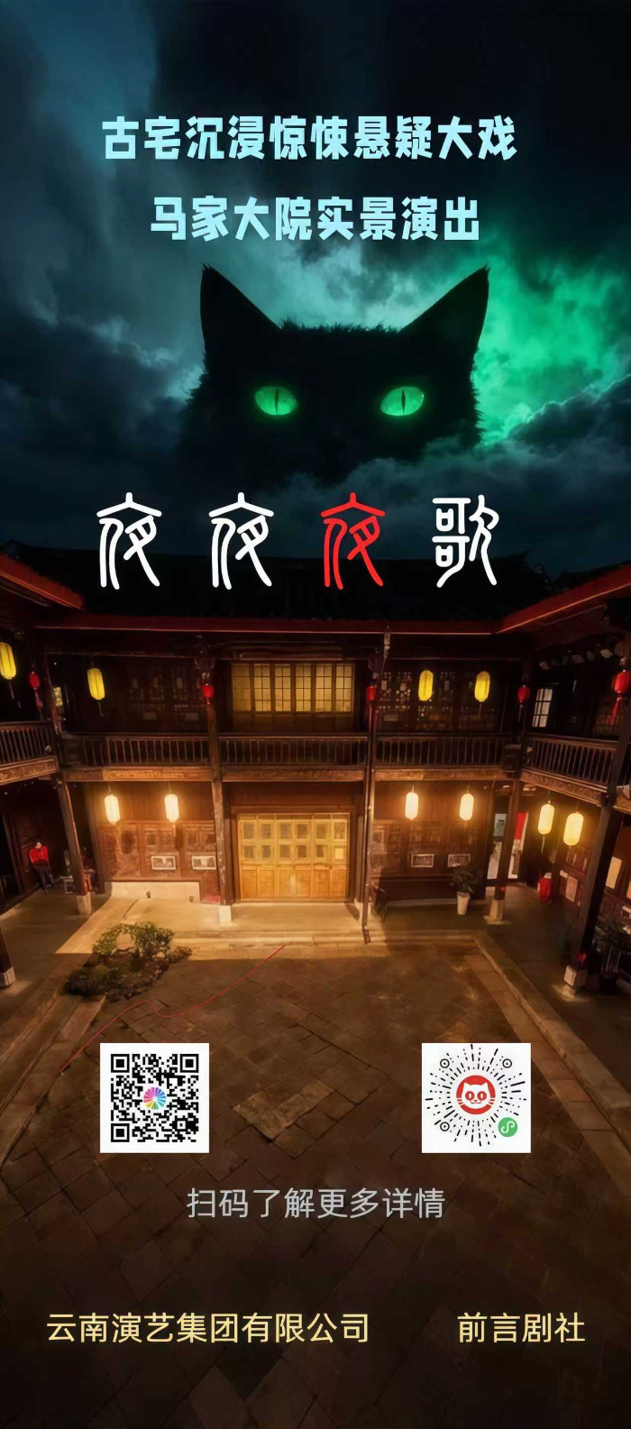 10月6日(中秋节)22:30,沉浸式悬疑剧——《夜夜夜歌》将在昆明马家大院首演。该剧由云南演艺集团有限公司与前言剧社联合出品,前言剧社左丘编剧,云南演艺集团有限公司段皓楠导演,以古宅为天然舞台,邀观众在百年院落中共度一个看戏、赏月的别样中秋夜晚。