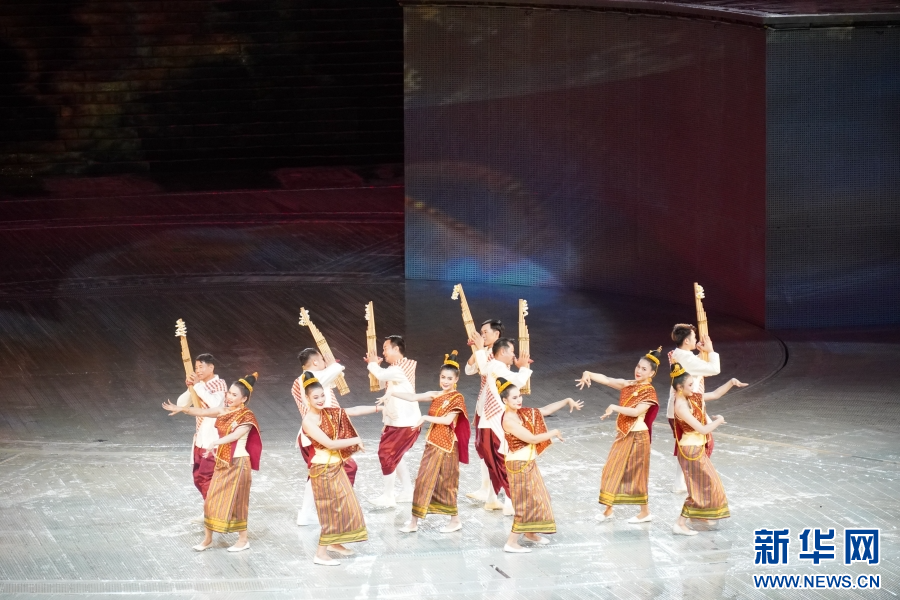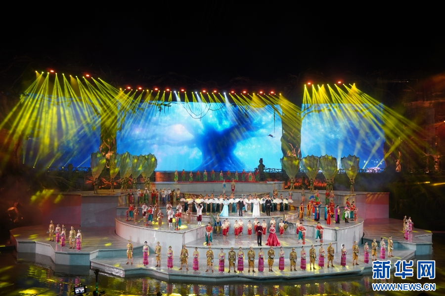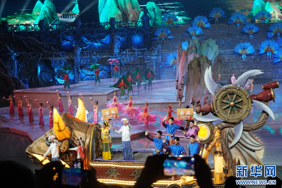 《共饮一江水》节目表演中,澜湄流域各国演员依次亮相(10月1日摄)。新华网发(柴静 摄)
