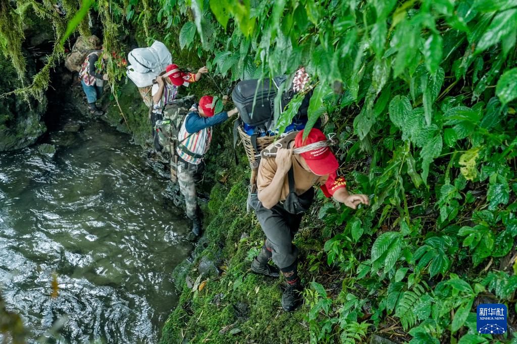界务员们背着大包徒步前往中缅39号界桩。新华社发 褚建伟摄