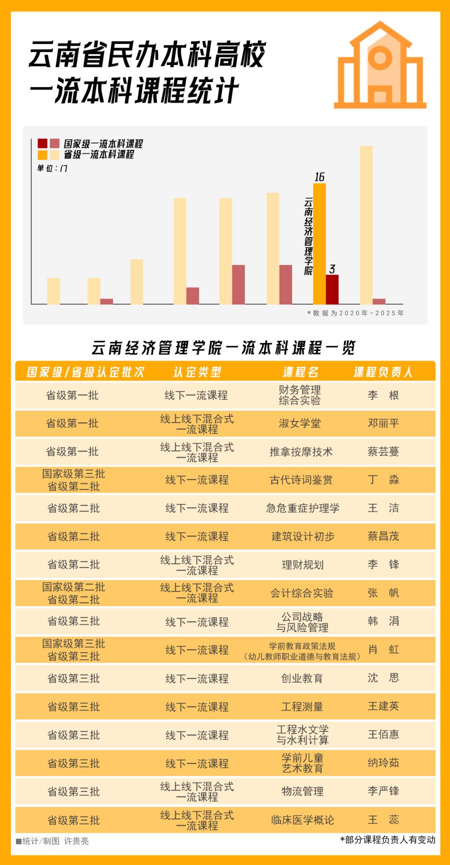 自2020年申报第一批省级一流本科课程以来,云南经济管理学院目前共有16门课程获得省级一流本科课程认定,其中3门被认定为国家级一流本科课程,认定数量位居全省同类高校前列。