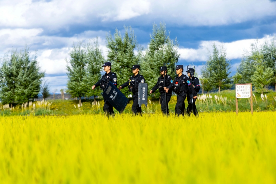 在鲁甸县砚池街道,特巡警正在万亩稻田景区巡逻(10月1日摄)。