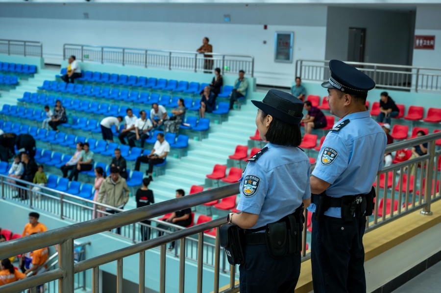 在巧家县体育馆,民警在篮球比赛期间开展安保工作(10月1日摄)。