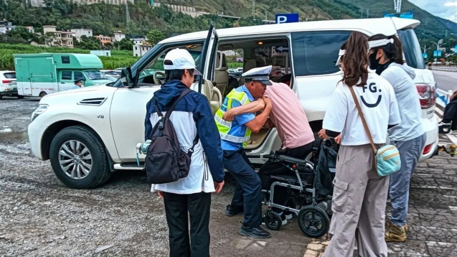 在巧家县蒙姑镇,执勤交警护送行动不便老人(10月1日摄)。