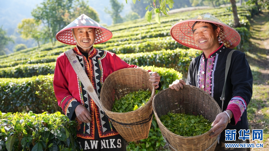 镇沅彝族哈尼族拉祜族自治县五一茶庄园的茶园里,茶农展示刚刚采摘的茶叶(3月26日摄)。新华网发(王杨静 摄)
