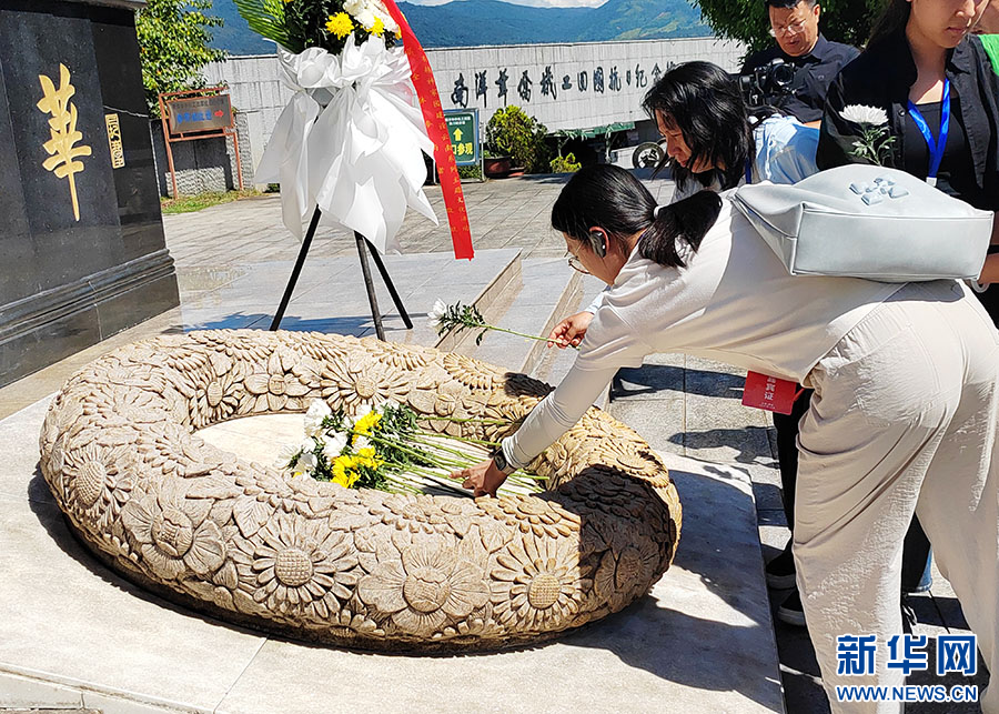 10月12日,“中华民族共有精神家园建设云南系列主题文化活动—德宏篇”嘉宾走进位于云南省德宏傣族景颇族自治州瑞丽市畹町镇的南洋华侨机工回国抗日纪念馆,在南洋华侨机工回国抗日纪念碑前,驻足瞻仰并敬献鲜花。