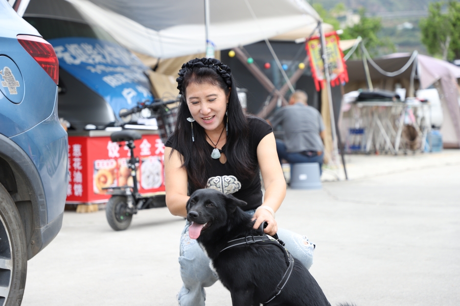 钱发荣和她的小狗玩耍(10月13日摄)。彭文琳 摄