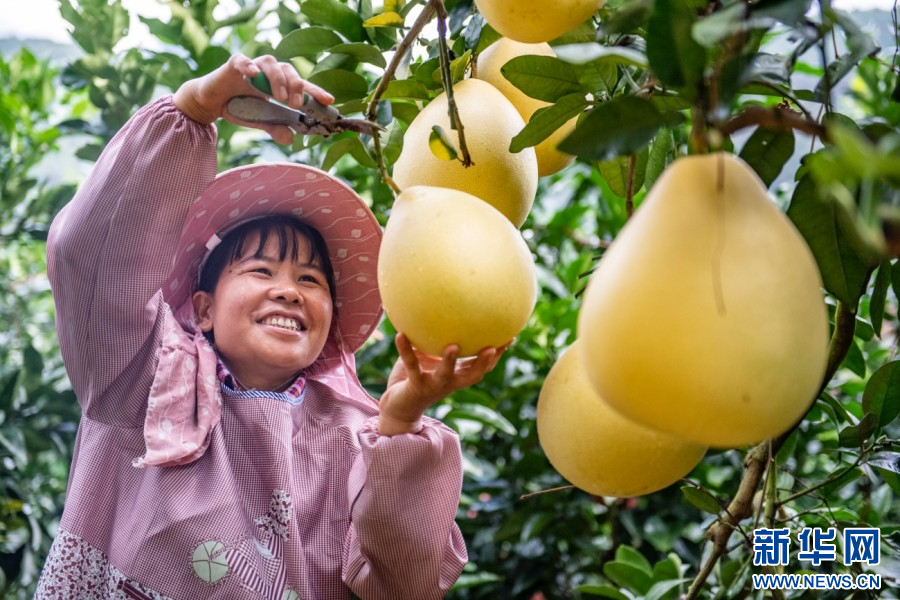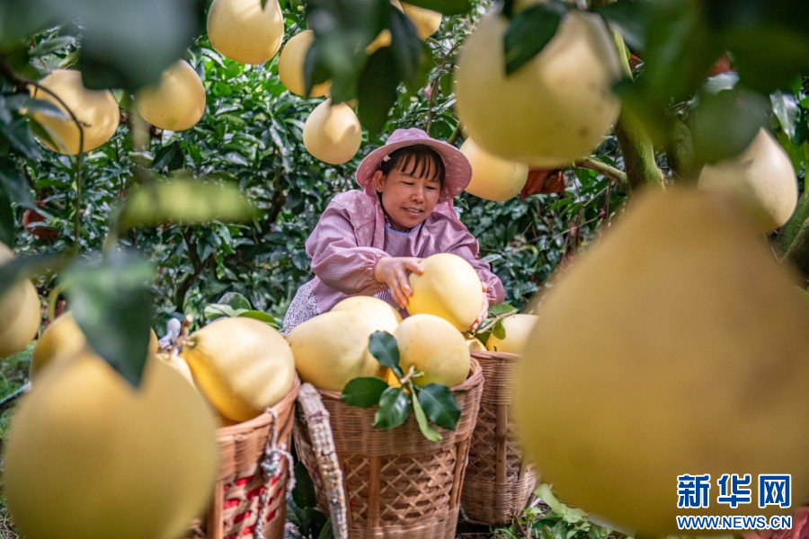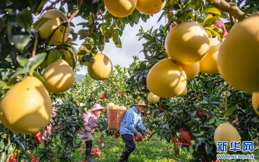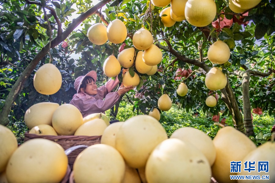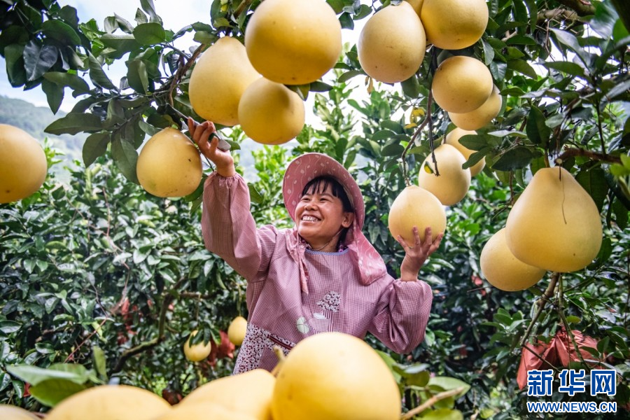 在云南省西畴县鸡街乡下坝村,村民正在采摘柚子(10月15日摄)。新华网发(熊平祥 摄)