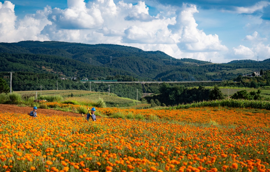 供电人员巡维电力线路,护航鲜花产业发展(9月5日摄)。