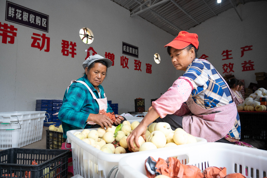 村民们正在作业车间把摘来的桃子进行分拣(9月22日摄)。冯琰 摄