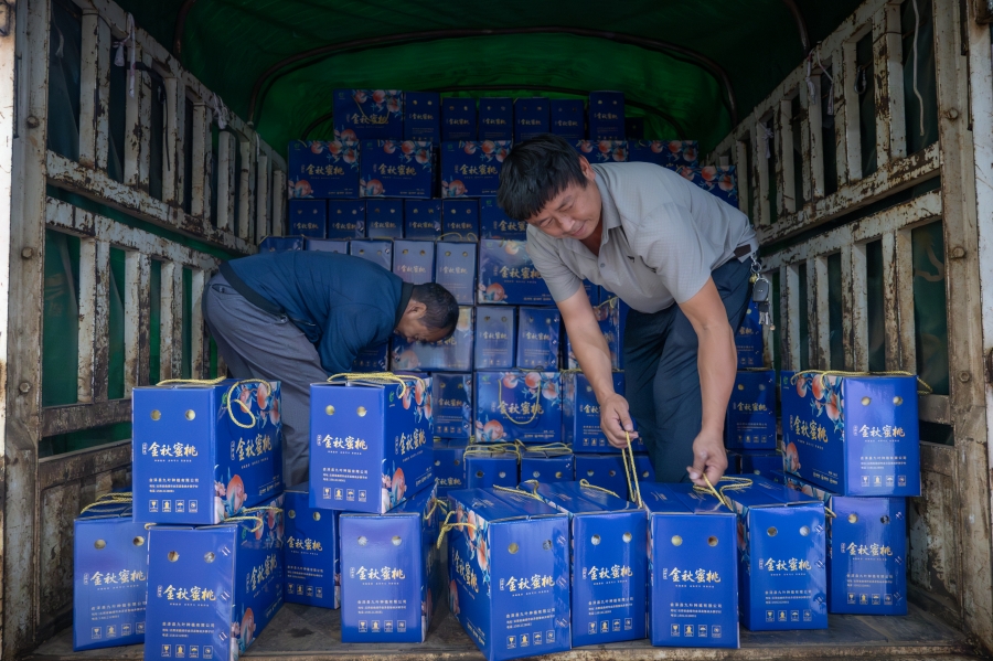 村民们把包装好的蜜桃装车准备发往采购点(9月22日摄)。冯琰 摄