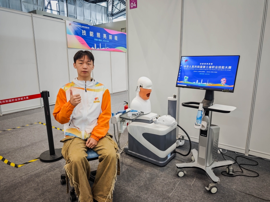 口腔修复工艺技术(世赛选拔)项目银牌选手廖世豪获奖现场(9月23日摄)。