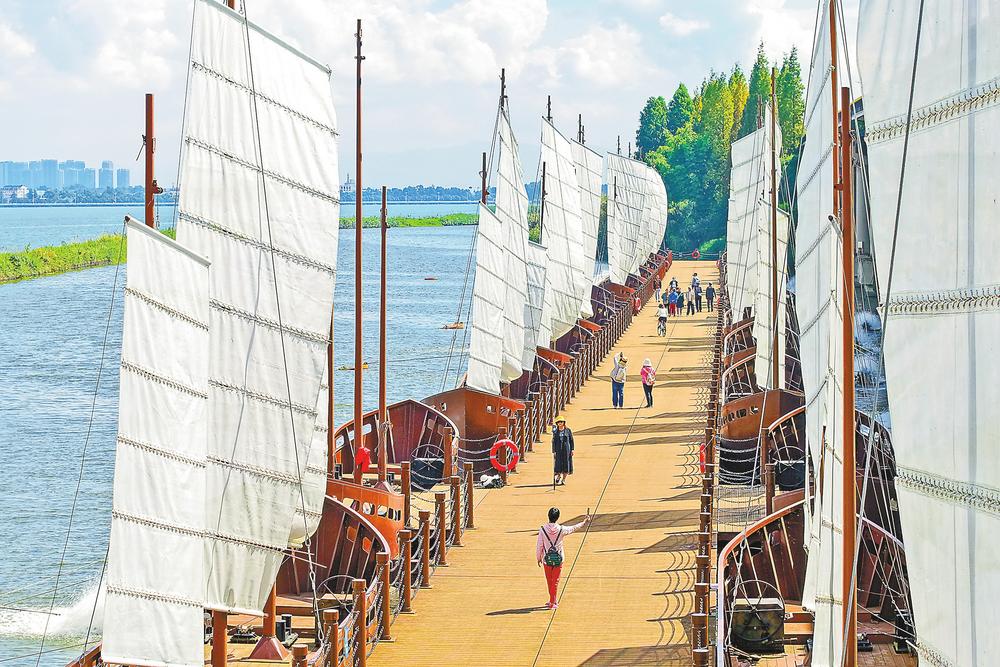 近日,昆明滇池绿道环草海段钢浮桥重新向公众开放。该桥是云南省首座大型钢浮桥,全长260米,以24组“帆船”造型艺术化再现“百舸争流、千帆竞发”的滇池古渡意象。该浮桥在2023年建成后曾对公众开放过一段时间,后处于封闭状态。此次重新开放,让市民游客得以完整体验环滇池的自然风光与人文景观。