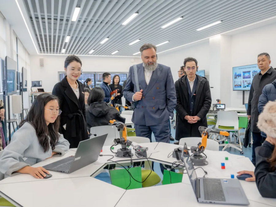访校期间,德方代表一行实地参观了云南工商学院的校园环境、实训基地与智慧教室,深入了解了学校“以学生为中心”的办学理念与产教融合实践。德方代表对学校先进的硬件设施、学生参与的真实企业项目表现出浓厚兴趣,多次驻足与师生现场交流,并高度关注学校的实训条件与育人成果。